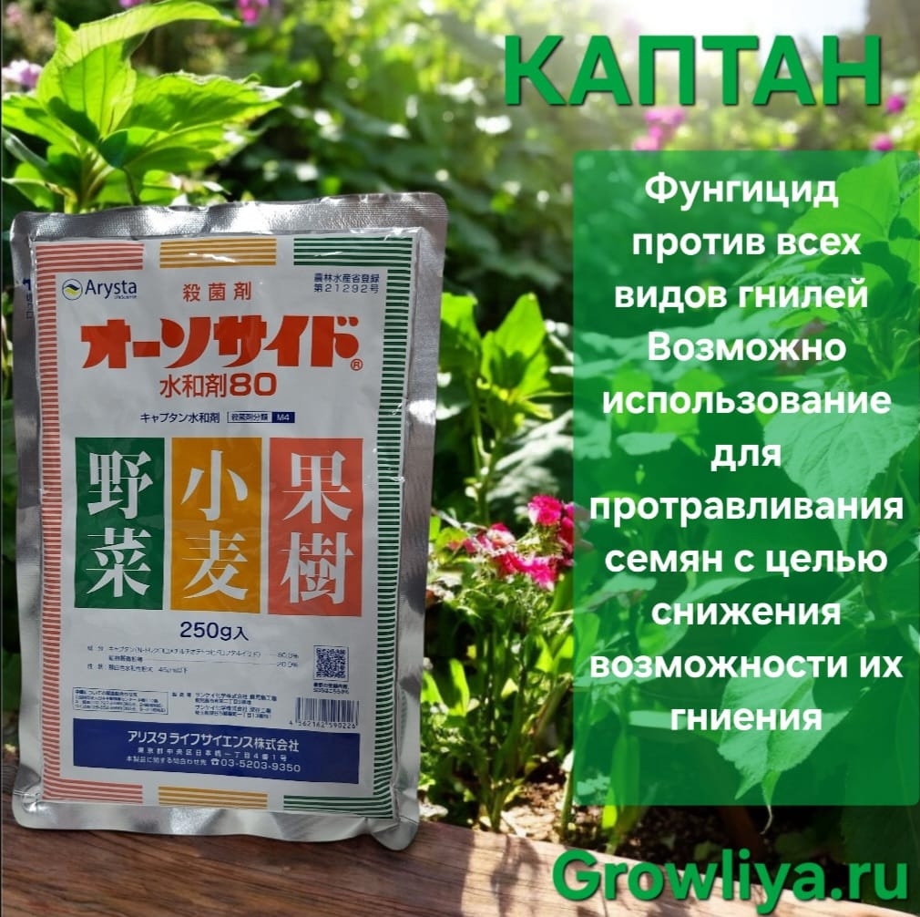 Каптан (Captan) — системный фунгицид японского производства с контактным и системным механизмом действия. Выпускается в форме водорастворимого порошка (ВРП) и содержит 80% действующего вещества — Captan. Препарат активно применяется в Японии уже более 60 лет и зарекомендовал себя как высокоэффективное средство против широкого спектра грибковых заболеваний.