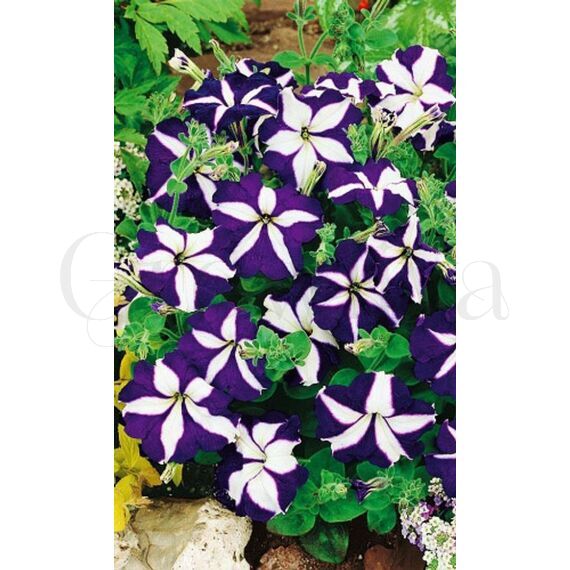 Новая модная группа ампельных петуний! Молодые растения прямостоячие; вырастая, побеги свешиваются и образуют лавину из цветов. Эффектные сине-фиолетовые воронковидные цветы с контрастной белой звездой в центре. Цветёт обильно с июня по октябрь. Великолепно подходит для подвесных корзин, балконных ящиков.