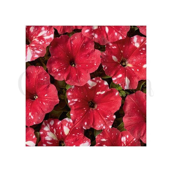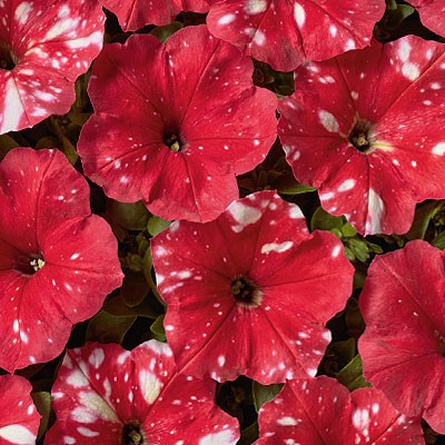 Растение высотой 30-35 см, хорошо ветвится. Диаметр цветка 6-7 см. Ни одна другая петуния не может похвастаться звездным крапчатым рисунком. Окраска - белые крапинки на красном фоне. Яркость и форма рисунка зависит от погодных условий - каждый цветок совершенно уникален. Быстро восстанавливается после дождя. Используют для оформления цветников, балконных ящиков и контейнеров.