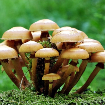 Традиционный в России съедобный гриб, всегда ценился за обильный урожай, сильный аромат и нежную мякоть. Опенок летний, в природных условиях, появляется в июне и сходит к концу августа, оправдывая свое название. Шляпка диаметром 4-6 см, в молодом возрасте полукруглая, позднее плоско-выпуклая с выступающим в центре бугром. Окраска ржаво-буро-коричневая, с концентрическими, более светлыми полосами. Мякоть белая, водянистая, довольно тонкая. Ножка цилиндрическая, немного суженная книзу, иногда с кольцом. Перед употреблением опята рекомендуется отварить и отвар слить. Далее грибы можно жарить, солить, мариновать, добавлять в супы. Сушеные грибы отваривать не обязательно. Советы по разведению: Выращивают как на открытом воздухе, так и в закрытых помещениях при температуре от 10 до 27°С. Благоприятное время для высадки грибов на древесную основу в природных условиях — с апреля по май или в августе, в помещении — в течение всего года. В качестве древесной основы используют свежее (1 месяц после срубки), влажное (влажность минимум 50-60 %) бревно лиственных пород (бук, граб, ольха, осина, ясень, клен, береза, тополь, ива, каштан, дуб) без признаков гнили, с корой и без веток, диаметром 20-50 см, длиной 30-50 см. Если древесина сухая ее замачивают в воде на 2-3 дня, избытку воды дают стечь. Пропитанную древесину помещают в теплое, проветриваемое помещение на несколько дней. Выращивание и уход: I этап - 1. В подготовленном бревне просверливают отверстия диаметром 0,8 см и длиной 4 см в шахматном порядке на расстоянии около 10 см друг от друга. 2. Вставляют грибные палочки в отверстия до упора (операцию проделывают в стерильных перчатках или продезинфецированными спиртом руками). 3. Оборачивают бревно полиэтиленовой пленкой, сделав небольшие отверстия для доступа воздуха. 4. Помещают бревно в темное влажное помещение и оставляют обрастать мицелием. При температуре 20 ?С бревно обрастает 2-3 месяца, при температуре 10 ?С – 3-4 месяца. При температуре выше 33 ?С мицелий может погибнуть. Бревна заросли если на поверхности, в местах заражения, виден белый мицелий. II этап - 1. В затененном и защищенном от ветра месте в саду выкапывают лунку глубиной 10-15 см, дно лунки увлажняют. Можно выращивать на балконе, посадив древесину после оброста мицелием в кадку с землей. 2. Обросшее грибницей бревно закапывают горизонтально в землю на ? толщины. Обсыпают почву вокруг бревна древесной золой (для борьбы с улитками). Оптимальная температура для образования плодовых тел – от 14 до 18°С. 3. В сухую погоду почву вокруг бревна поливают каждую неделю из расчета 5л на 1м?. Поздней осенью бревно присыпают листьями и оставляют зимовать. 4. Со следующей весны закладку регулярно увлажняют по мере необходимости. Плодоношение: Первый урожай при выращивании на мягкой древесине (береза, тополь, ива, липа) через 4 месяцев, на твердой (бук, дуб, ясень, клен) – через 9 месяцев. Плодоношение волнами до 5 лет на мягкой древесине, до 8 лет на твердой. Урожайность: От 20 до 50% от веса бревна. Состав: Мицелий грибов "Опенок летний" на древесных палочках.