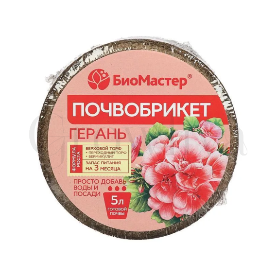 Купить БиоМастер Почвобрикет Герань круглый 5 л в интернет магазине ГровЛия - по выгодной цене. БиоМастер Почвобрикет Герань круглый 5 л: характеристики, отзывы, описание, обзор, фотографии. Инструкция по применению в комплекте.