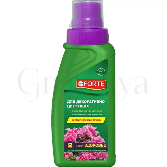 Концентрированное органо-минеральное удобрение для декоративно-цветущих растений серии Здоровье подходит для афеляндры, бальзамина и бегонии,. Гардении и герани, камели и спатифиллума. Фиалки, фуксии и хойи. Цикламена и маргаритки, петунии и роз. А также цветущих луковичных растений. Увеличивает продолжительность жизни цветка, способствует формированию крупных цветоносов, обеспечивает яркий цвет бутонов, повышает устойчивость к болезням и вредителям. Серия ЗДОРОВЬЕ создана лабораториями Bona Forte для восстановления истощенной почвы и повышения иммунитета растений. Подкормка для цветов Бона Форте содержит полный комплекс веществ, необходимых для полноценного питания и развития растений. Азот, фосфор и калий - для обеспечения жизнедеятельности растений. Микроэлементы в хелатной форме способствует полному их усвоению и пролонгированному действию. Гуминовые кислоты - активный природный стимулятор: бережно восстанавливает почву и иммунитет растений. Гуминовые вещества накапливают химические элементы и энергию, сохраняя их в течение длительного времени. Лучший результат дает совместное использование корневых (полив) и внекорневых подкормок (опрыскивание листьев раствором удобрения). Удобрение не боится заморозки и после размораживания сохраняет свойства. После окончания срока годности не теряет агрономической ценности.