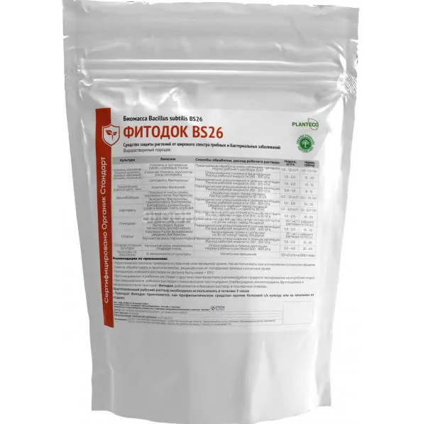 Фитодок BS26 - биологический фунгицид широкого спектра действия, препарат в сухой форме для профилактики и лечения комплекса болезней вызванных фитопатогенными грибами и бактериями, при выращивании овощных, плодово-ягодных, сельскохозяйственных и декоративных культур.