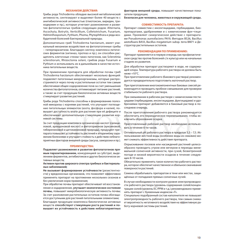 Биомасса Trichoderma harzianum Триходермин TH82 - полифункциональный активный биологический комплекс широкого спектра действия для содействия в профилактике комплекса болезней растений, вызванных фитопатогенными грибами и бактериями на основе спор и мицелия грибов Trichoderma harzianum и продуктов их метаболизма (биологически активные вещества).