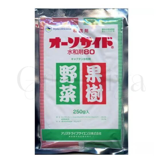 Это комплексное дезинфицирующее средство, широко используемое в мире в течение длительного времени. В Японии используется в течение 60 лет. Обладает стабильным профилактическим действием при широком спектре заболеваний для многих культур, в том числе цветов, овощей и фруктовых деревьев. Использование: опрыскивание в вегетационный период, дезинфекция семян и орошение почвы на стадии рассады позволяют предотвратить гниль и поражение рассады. Корни растений обрабатываются каптаном для предотвращения гниения. Каптан обладает высокой фунгицидной и слабой бактерицидной активностью. Риск развития лекарственной устойчивости низок. Эффективен против устойчивых бактерий. Эффективен против: различных гнилей - гниль корневой шейки, корневая гниль, стеблевая гниль (фузариоз, эрвиния, ризоктония, питиум), черная пятнистость, бурая пятнистость, кольцевая пятнистость, мучнистая роса, ложная мучнистая роса, фитофтора, антракноз, ботритис серый (серая плесень), парша. Использовать методом опрыскивания 1 гр на 0,4 - 1,2 л воды до 8 раз. Возможно использовать для протравливания семян, клубней, для замачивания и порошкового покрытия. Состав: Captan 80% Свойства: растворимый порошок